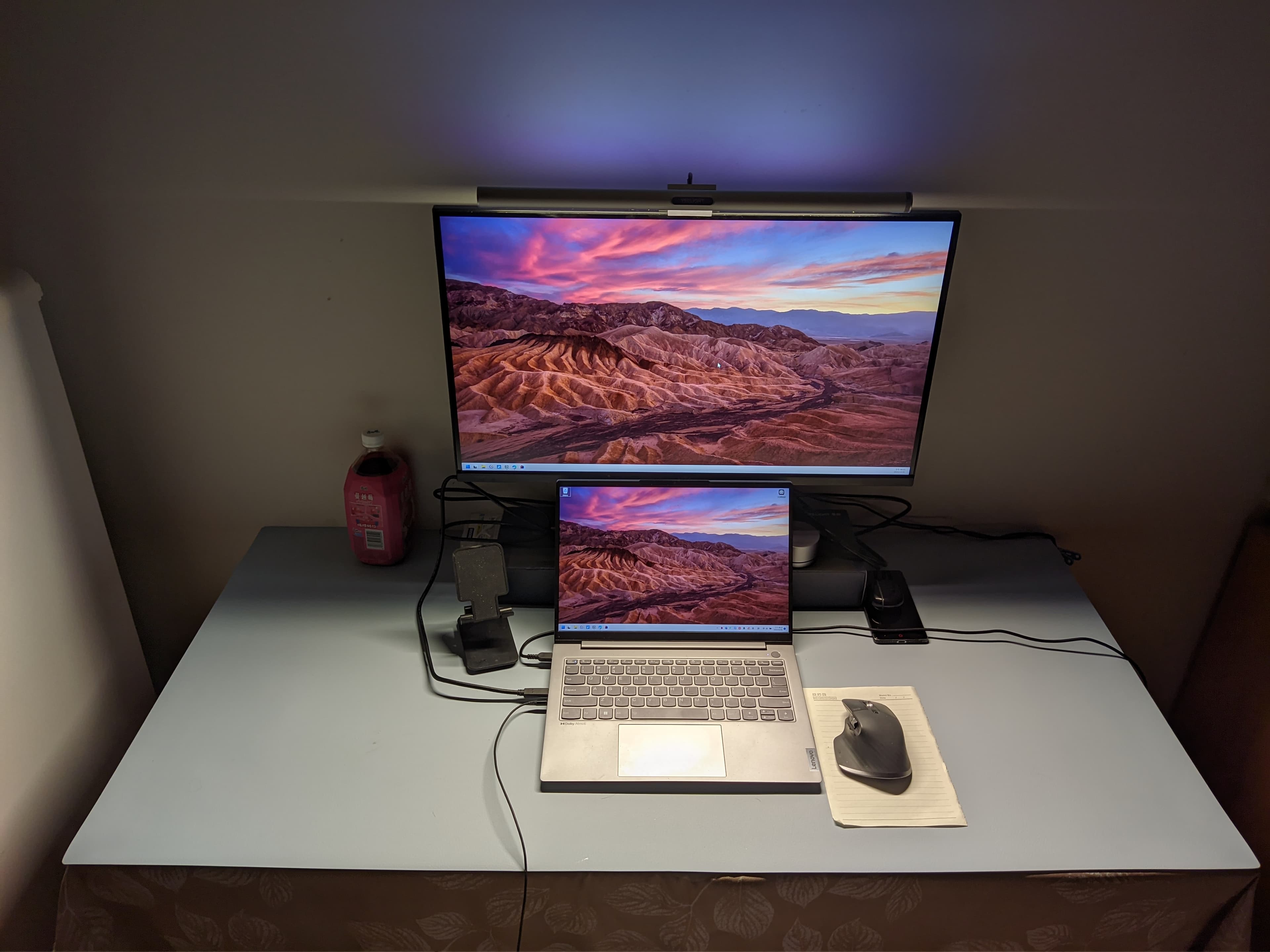 因为 12 月换了新房子,比之前住的自如大了不少,加起来差不多 20 平,有更大的空间可以折腾了,于是把之前在学校里跑 VPN 的小主机翻了出来,接上之前旧的笔记本硬盘,装了个黑群晖。另外也淘了一块 4k 27 寸的显示器,顺便买了个屏幕挂灯。PS:忽略纸鼠标垫,因为习惯了光滑的桌面鼠标垫,加了一个 TPU 桌垫实在太涩了,移不动。
