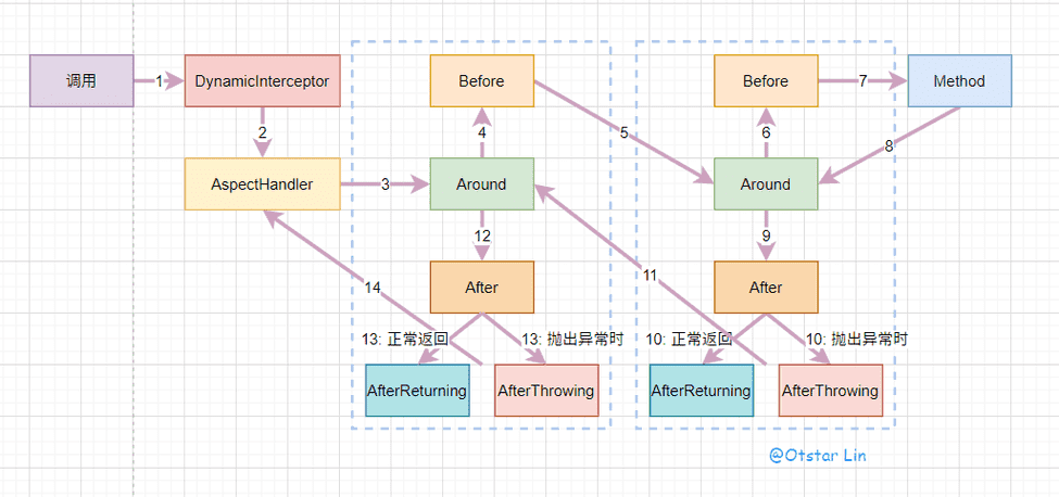 }然后是 AspectHandler,这个类是一个责任链模式的实现,具体的流程将代码后的图。